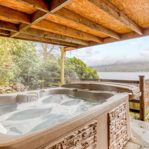 Head outside onto the decked area, enjoying magnificent views over Loch Earn and the surrounding mountains. You will find the fantastic sheltered yet open fronted hot tub, the perfect place to relax and unwind with LED lighting and magnificent views. Enjoy al fresco dining and lazy evening stargazing across the loch and surrounding mountains, perhaps with a wee dram, good local ale or a nice glass of wine. There is ample off-road parking available next to the lodge.