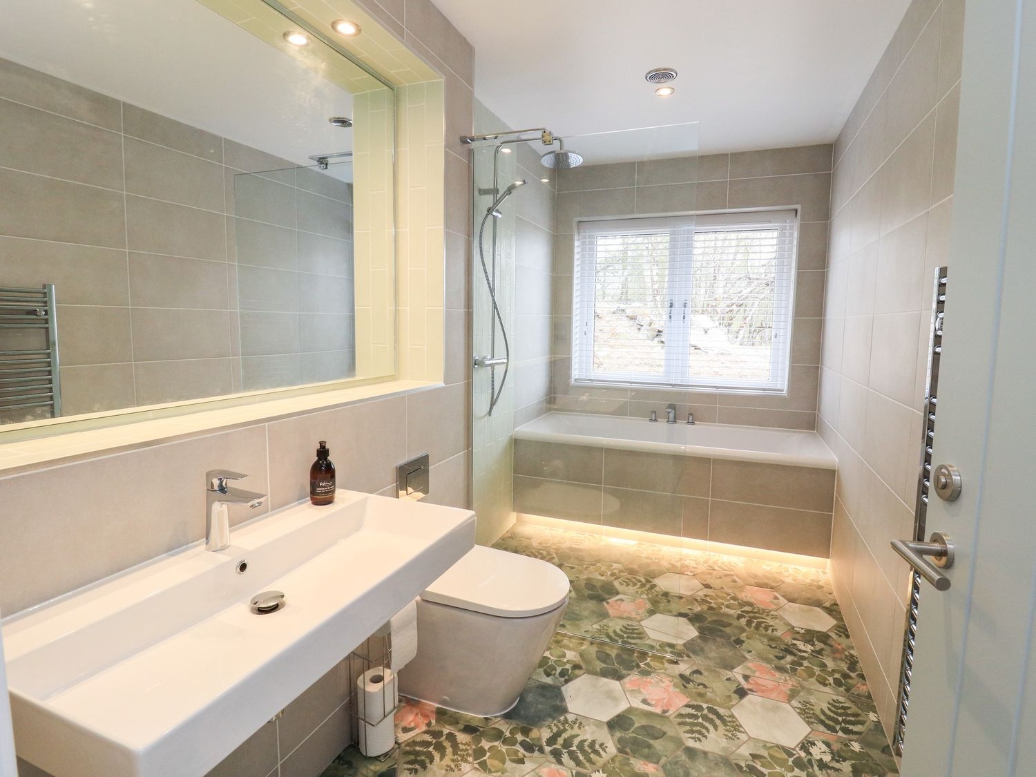 - Bathroom with bath, walk-in shower, basin, heated towel rail and WC