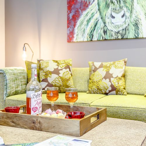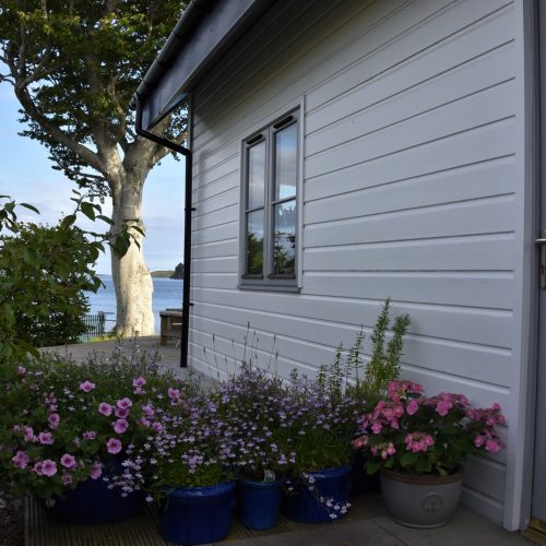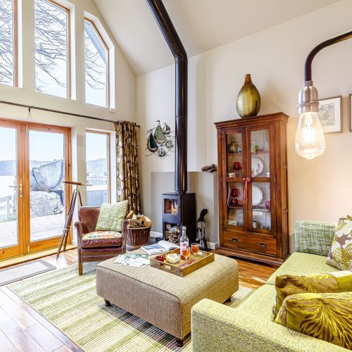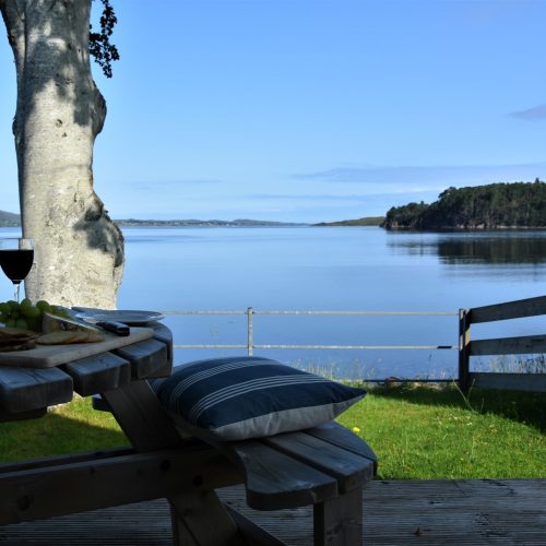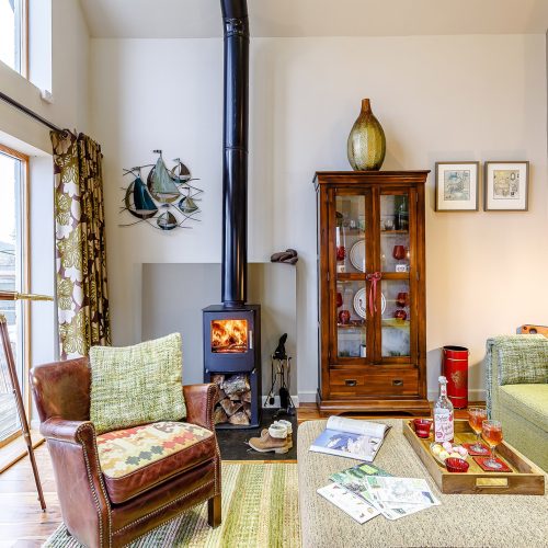 This tastefully decorated boathouse offers a spacious open-plan studio-style space, complete with traditional king-size bed, cathedral ceiling, wood burner and mood lighting. The comfy sofa is the perfect spot to enjoy the sunset over the sea while you watch the wildlife swim past. The TV has Sky Entertainment Plus so you can watch your favourite movie after a long day. The bathroom has underfloor heating, a spacious bath, separate shower and WC. Outside, and up a few steps is the shepherd’s hut with tasteful, retro style decor. Here you will find an electric hob, combi microwave oven, toaster, a small fridge and a kettle for brewing up a cuppa. There is also a table and seating to enjoy your meals, where you can enjoy the views from the windows overlooking the fast-flowing river or open the stable door for views across the bay and to the hills beyond. This is perfect place to relax and indulge your artistic talents. Whether you like to sketch, paint, draw or write the next best-selling novel, you will find plenty of inspiration inside and outside the hut.
