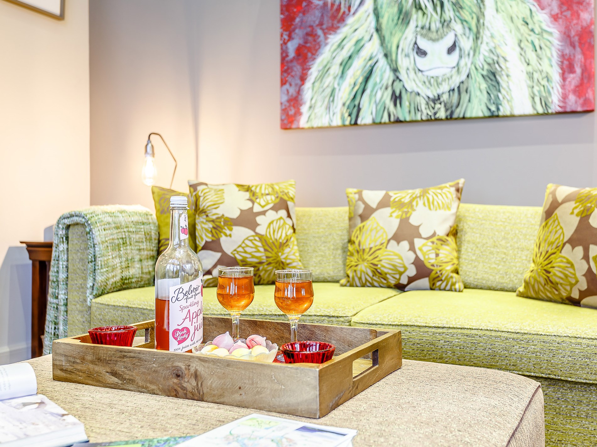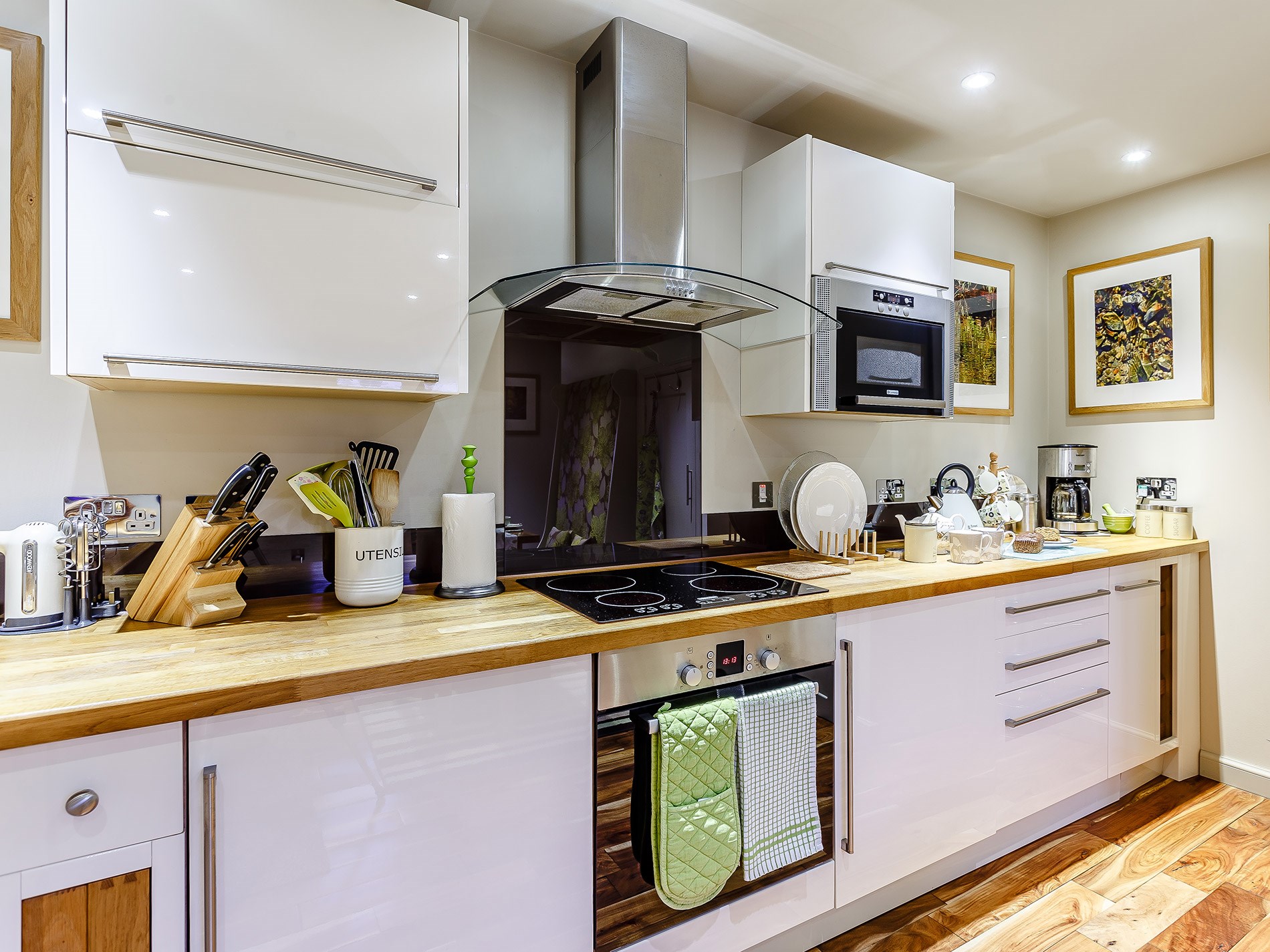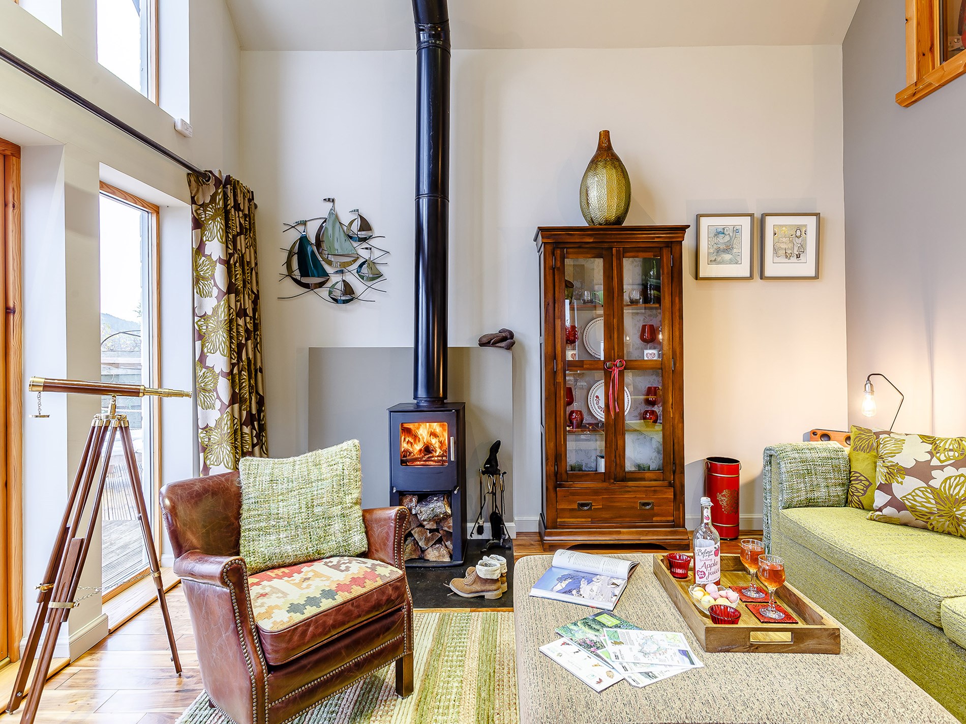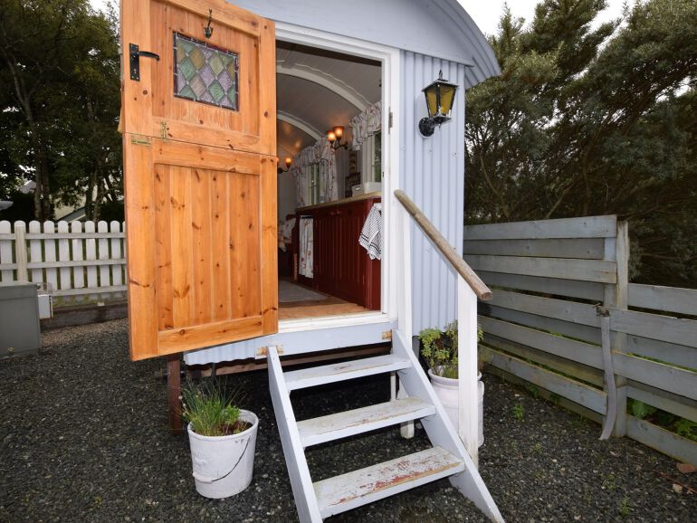 This tastefully decorated boathouse offers a spacious open-plan studio-style space, complete with traditional king-size bed, cathedral ceiling, wood burner and mood lighting. The comfy sofa is the perfect spot to enjoy the sunset over the sea while you watch the wildlife swim past. The TV has Sky Entertainment Plus so you can watch your favourite movie after a long day. The bathroom has underfloor heating, a spacious bath, separate shower and WC. Outside, and up a few steps is the shepherd’s hut with tasteful, retro style decor. Here you will find an electric hob, combi microwave oven, toaster, a small fridge and a kettle for brewing up a cuppa. There is also a table and seating to enjoy your meals, where you can enjoy the views from the windows overlooking the fast-flowing river or open the stable door for views across the bay and to the hills beyond. This is perfect place to relax and indulge your artistic talents. Whether you like to sketch, paint, draw or write the next best-selling novel, you will find plenty of inspiration inside and outside the hut.